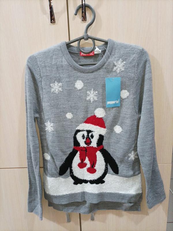 Новий новорічний светр для дівчинки,німецького бренду Pepperts. Колір : сірий. Принт : пінгвін. Спинка трохи довша за перед. Зріст 122/128 см(6/8 років): Довжина - 50 см ПОГ - 31 см Плечі - 28 см Рукав від плеча - 46 см Доставка : Нова пошта Укрпошта