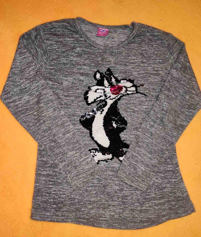 Кофточка на девушку в красивом состоянии. Размер 140. Спереди кот с перевертышами.