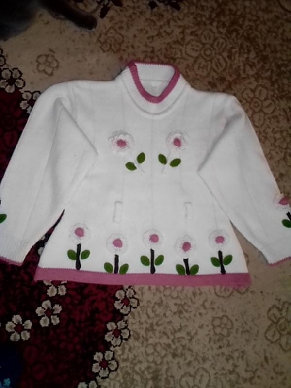 Теплий светр для дівчинки на вік 5-7 років.Орієнтуйтесь на заміри(вказано на фото). Теплий, зручний, красивий светр для повненької дівчинки.Стан хороший.Із недоліків тільки наявність ковтунців на рукавах,та відсутність однієї квіточки на рукаві( показано на фото). Покупку робіть помірковано.Повернення не має.Оплата на карту Приватбанку.Порядність гарантую.