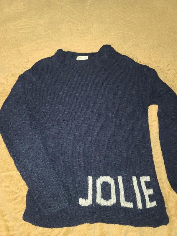 Свитер темно-синего цвета с люрексовой надписью, на фото не передать. размер указан 12-13 лет, но маловероятно, замеры на фото