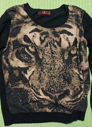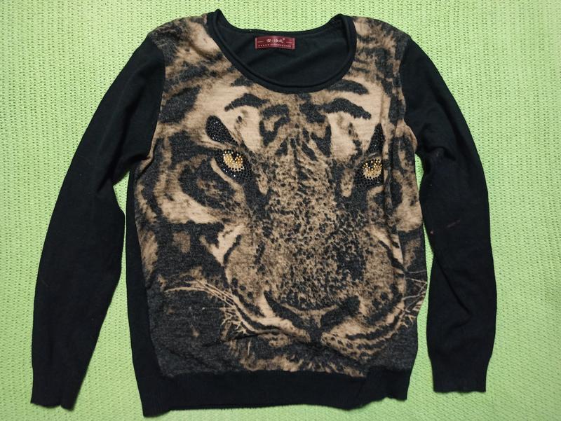 Светр із тигровим принтом, довжина 58 см, ширина 48 см, внизу по гумці 40 см, довжина рукава 55 см, плечі 38 см. На останньому фото нюанс — світна пляма біля шва на рукаві.