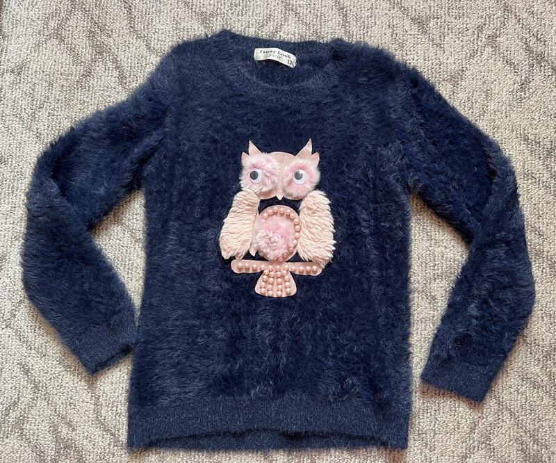 Девчачий, стильный, теплый свитер, в темно синем цвете с нашивкой совы. Подойдет на возраст 12-14 лет, был одет всего несколько раз