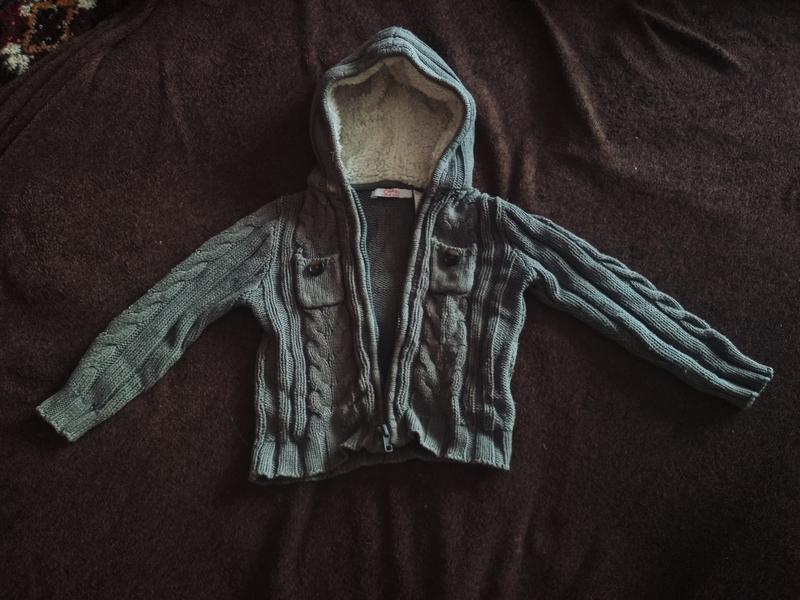 Серая вязаная кофта на молнии с утеплённым капюшоном