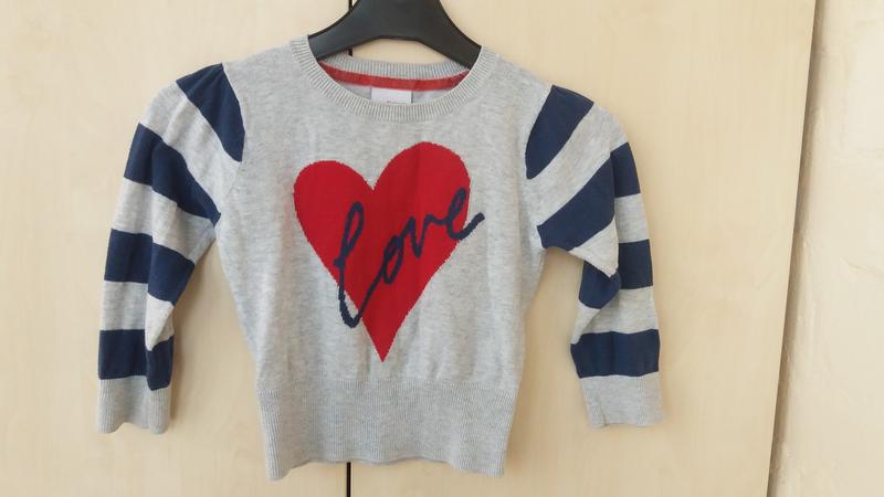 Свитер сердечко. Состояние удовлетворительное. Возраст указан 5-6 лет. Замеры: полуобхват груди – 32, полуобхват талии – 26, длина 36, рукав-33.