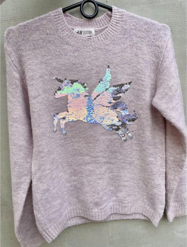 Продам свитер для девочки 9-10 лет рост 134-140 см бренда H&M. Стан - идеальный. Замеры: Длина от плеча 54 см Рукав 53 см ПОГ 48 см. Свитер очень хорошо тянется! Украшен пайетками.