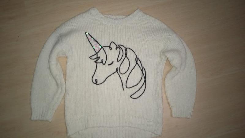 Свитерок на 6-7 лет. Рост до 122 см. Нарядный и удобный. Рог единорожки украшен пайетками. Замеры по требованию.