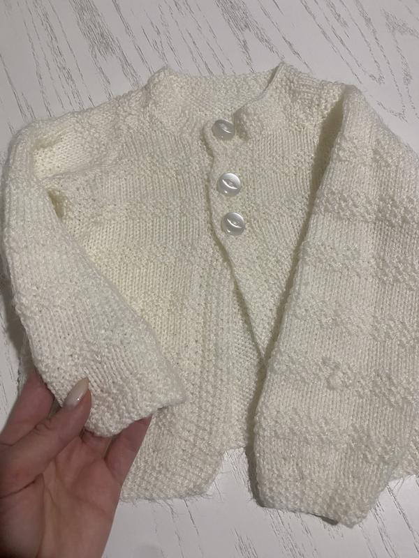 Кофточка вязаная очень приятная, мягкая ткань, не колется,белого цвета,мтан отличный,размер 2.5-3,5 рочки(98-104)