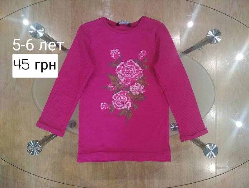 Свитер, реглан удлинен немного, на девочку 5-6 лет. Цвет фукции, но не такой яркий как на фото, а обычный. Рисунок на свитерике, то не вышивка. Внутри тонкая махра. Состояние отлично. Пересылаю после оплаты на карту.