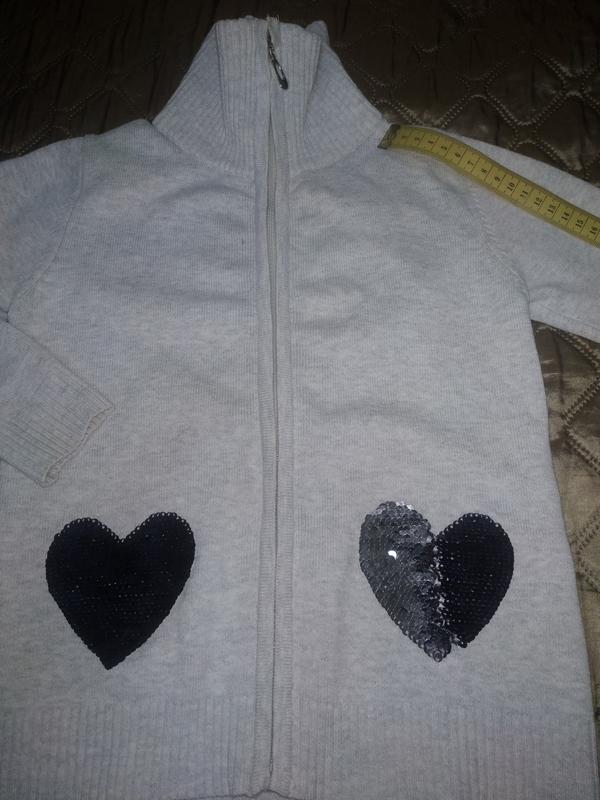 Гарна тепла кофта . Плотная вязка, не объемная. Высокая горловина красиво прикрывает шею. Сбоку сердечки из пайеток-перекидочек. Материал не кашлатится. Состояние очень красивое.