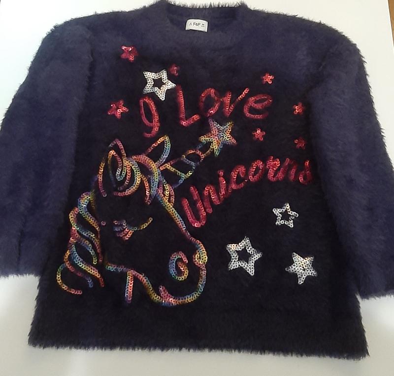 Замечательный очень теплый свитер для девочки от F&F на 6-7 рочков. Свитер пушистик с пайетками, они пристроченные, очень хорошо держатся. Состояние отлично. цвет темно-синий.