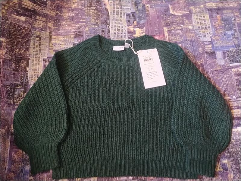 Вязаный свитерик на девочку темно зеленого цвета, рукава на манжетах. Указан размер 4/104 Состав 100 акрил Замеры длина от плеча 36, от подмышки 19, рукав от шеи 40, нот 38