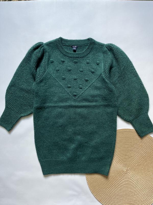 Свитер зеленого цвета на девочку. Рост 108-113 см. Длина - 56 см. Длина рукава - 42 см. Полуобхват груди - 36 см.