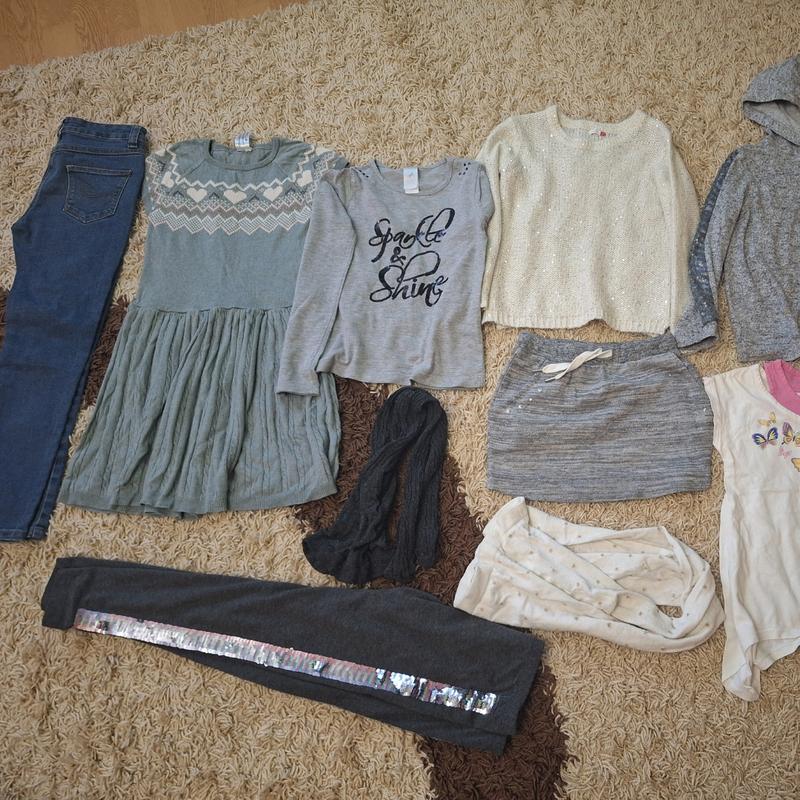 Пакет вещей для девочки р.122-128. Джинси, теплые брюки платье, лосины с ловушками, футболка с бабочками, теплая кофта с молниями Levi's, юбка, серая кофта с капюшоном, 2 колгот.