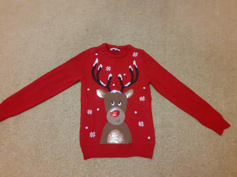 свитер новогодний, рождественский с люрексом на 11-12 лет .Теплый, приятный к телу, нюанс на внутренней стороне (вытянулись нитки на внутренней стороне, см фото).