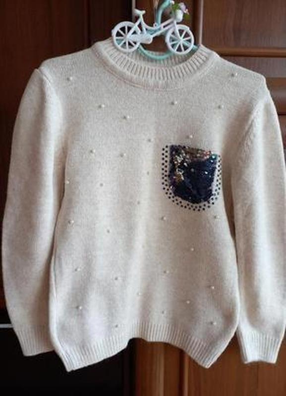 Состояние нового. На кармашке двойные пайетки. Бусины проклепаны поэтому при стирке не оторвутся. Теплый красивый. На 8-10 лет. Качество шикарное.