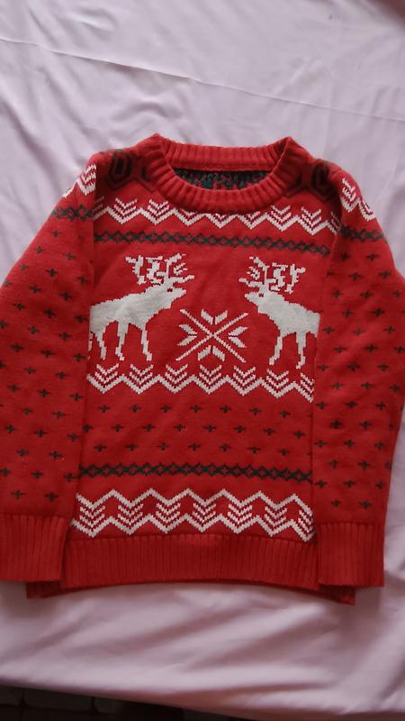 Очень теплый свитер с оленями, подойдет и мальчику, и девочке. На лет 10-12, смотрите замеры на фото.