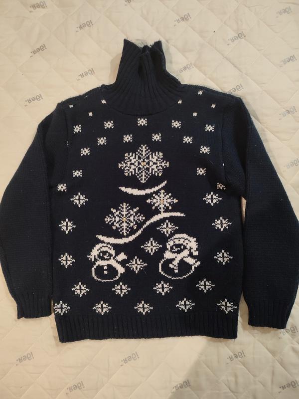 Очень теплый свитер темно-синий, в состоянии нового, на рост 146см. Замеры: Длина рукава от ворота 56см Длина по спине 47см