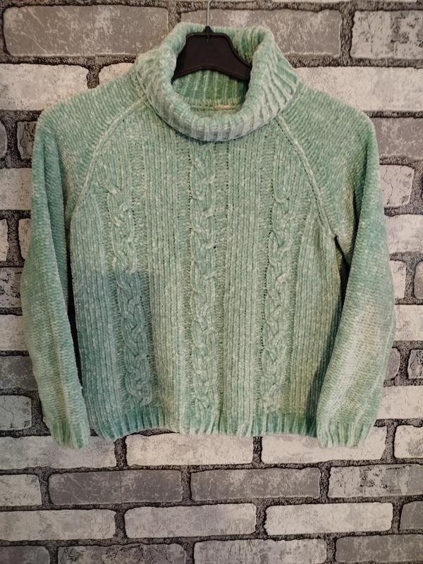 Очень мягкий, приятный к телу свитерик на девочку 7-9 рочков. Смотрите замеры. Цвет очень красивый, бирюзовый, как на последнем фото. Состояние отличное. Рукав от воротника 52 см. Плечи свободно Высота от воротника 42 см Ог 40 см