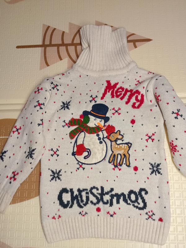 теплый свитерик с новогодним принтом, очень хорошего качества (Турция) на девочку, или на мальчика (у нас носила девочка) на 2-3 года 92-98 рост Длина 41, ширина 29, рукав 35