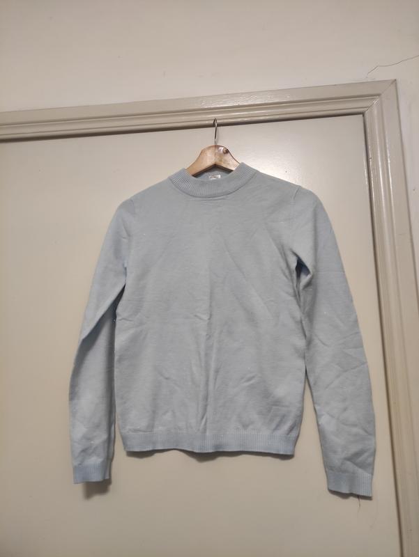 Свитер новый цвет светло голубой с нитью люрекс серого цвета на горловине имеется слегка заметно пятнушек тональный крем Длина изделия 53 см обхват груди 80 рукав от плеча 56 см рукав от горловины 64 см