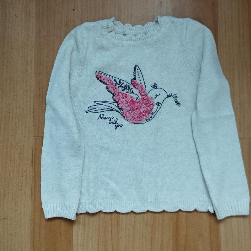 Свитер белый с объемной птичкой розового цвета бренд LC-WAIKIKI на девочку 6-7 лет, размер 116/122. Длина -43, ширина -34, рукав -48 см