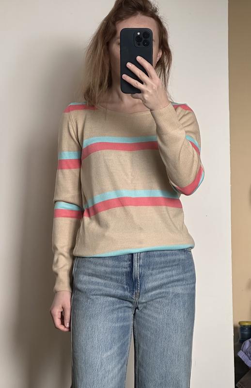Смугастий светр з бавовний. Б/у декілька разів. У гарному стані. Підійде приблизно на 12 років. Одягнутий на фото на зріст 154 см Довжина рукава 59 Довжина по спині 57 Довжина між пахвами 43