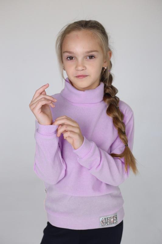 Светр для дівчинки з м'якої, приємної до тіла тканини, з легким м'яким начісуванням зсередини. Склад тканини: 70% віскоза та 30% акрил. Светри не кошлатяться і не коляться. Сезон - демісезон або зима, за умови, що у приміщенні опалюється, наприклад, у школі. Плечові шви доповнені силіконовою стрічкою, тому виріб не деформується після прання. Високий комір стійка з підворотом захистить у холодну пору року. Рукави та низ светра на манжетах. Светр доповнений невеликою красивою фірмовою нашивкою. Колір: ліловий (бузковий), бежевий, світло-рожевий Розміри: 104, 110, 116, 122 - 365 грн, 128, 134, 140, 146 - 415 грн
