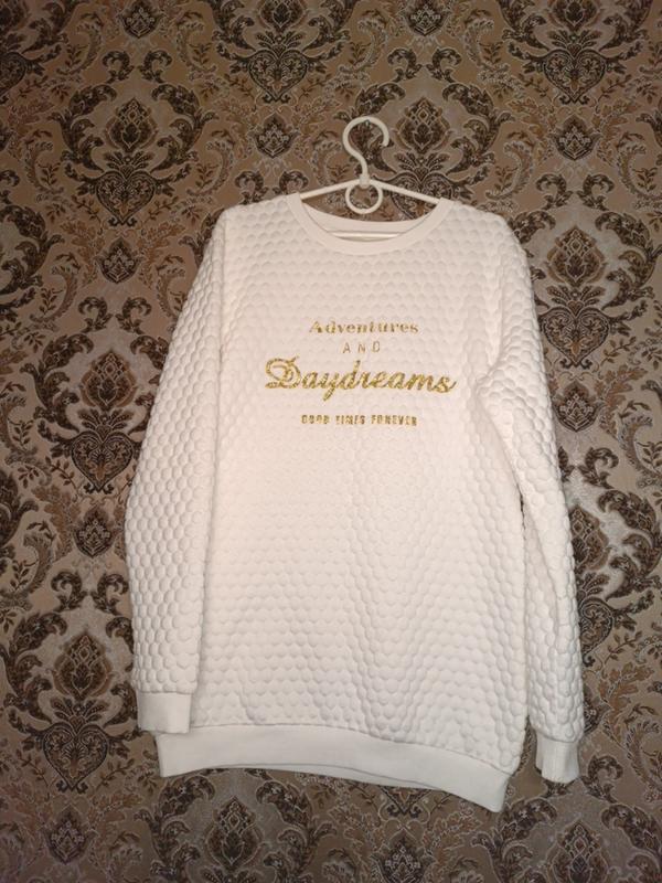 удлиненный свитер белого цвета с надписью золотистым. ткань полиэстер эластан, есть катунцы, длина по спинке 60 см, ширина под рукавами 42 см, плечи 37 см, рукав 55 см.