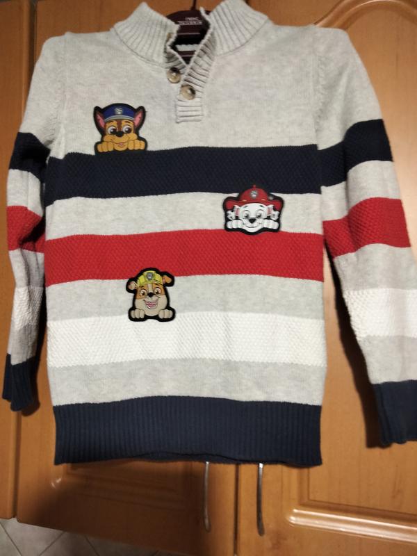 Теплый свитер для мальчика с персонажами Щенячьего патруля в красивом состоянии от C&A.Замеры : длина свитера 47 см, ширина плеч 29 см, длина рукава с резинкой 47 см.