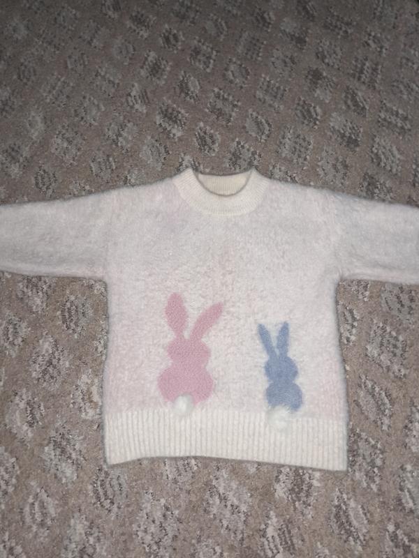 пухнастий (плюшевий) дитячий светр із двома нашивками у вигляді кроликів рожевого та синього кольорів.