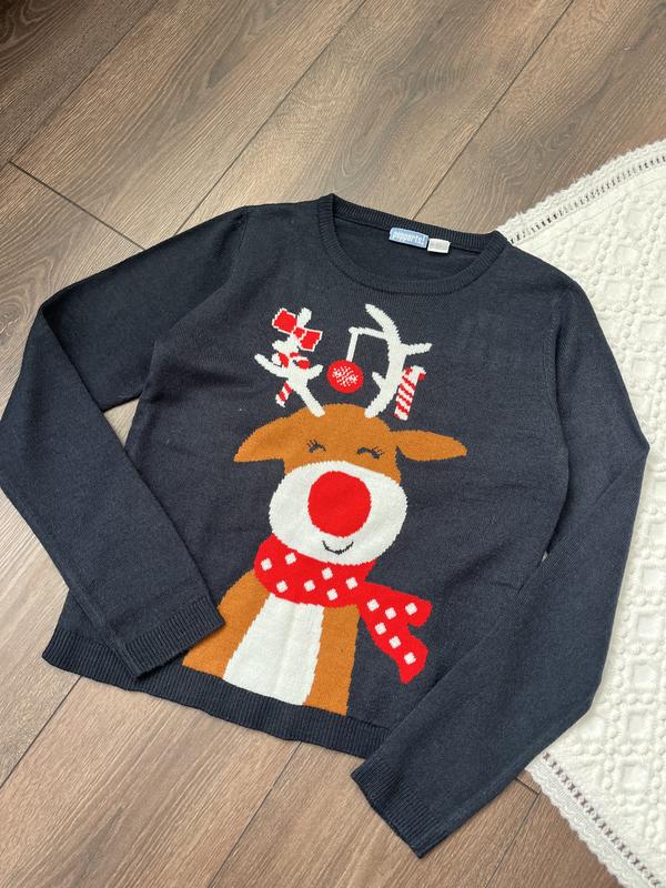 Темно синій сірий светр з оленем різдвяний кругла горловина унісекс для хлопчика для дівчи...