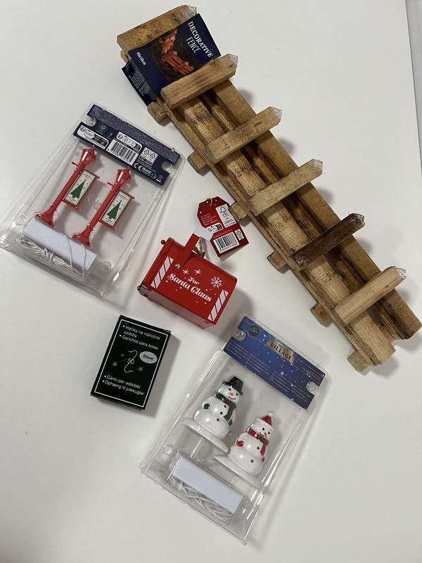 В набір входить новорічний парканчик , гірлянди, іграшка скринька на ялинку та гачки на ялинкові іграшки