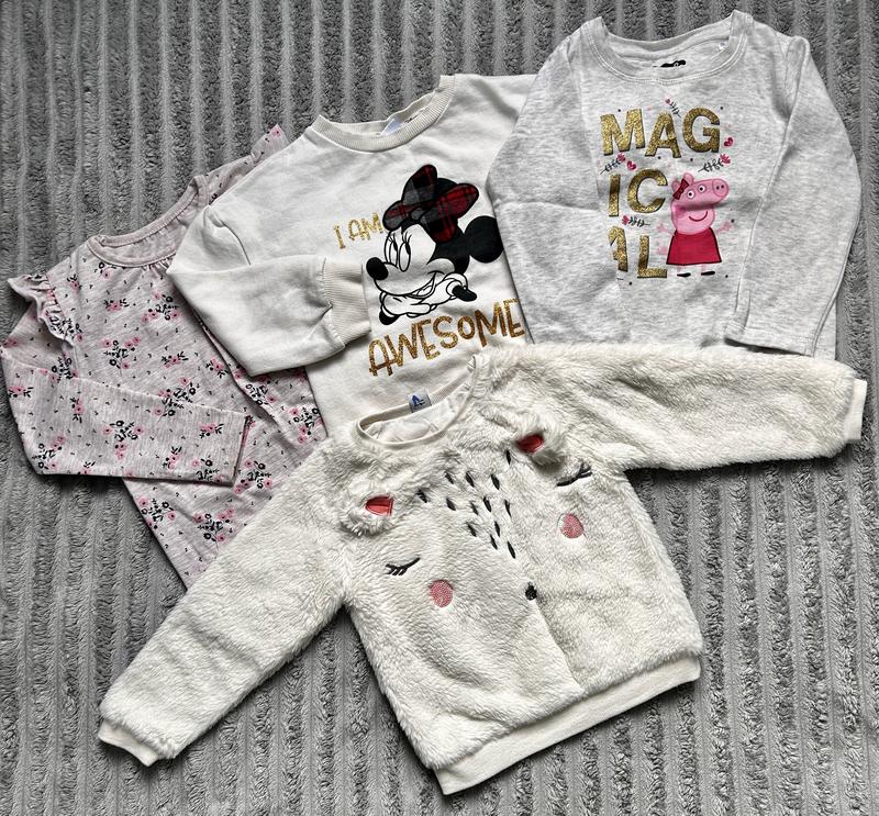 Довжина - 38 см, довжина рукава - 28 см, напів обхват грудей - 32 см. Три светрика з начесом і одна кофтинка в квітку тонка. Ціна вказана за 4 речі. Можна і окремо вибрати.