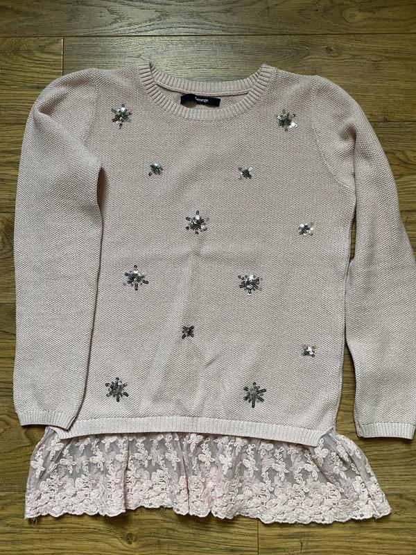 Светр для дівчинки в ідеальному стані, без плям і пошкоджень. Прикрашен мереживом знизу та сріблястою ниткою у вʼязці, що придає йому святковий вигляд.