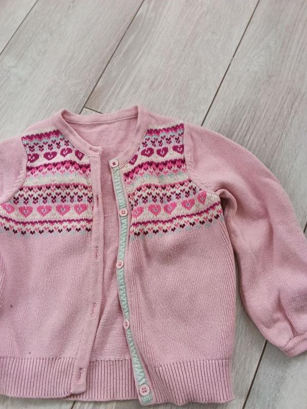 Вязаный свитерчик для девочки примерно на 2 года 88-90 см. Мягкий и теплый, выполненный в нежных розовых тонах с декоративным узором в виде сердечек и геометрических элементов. Имеет длинные рукава, удобные манжеты и застежку на пуговицы спереди. Свитер носили, но он в очень хорошем состоянии, без дефектов. Идеально подойдет для прохладной погоды и ежедневной носки.