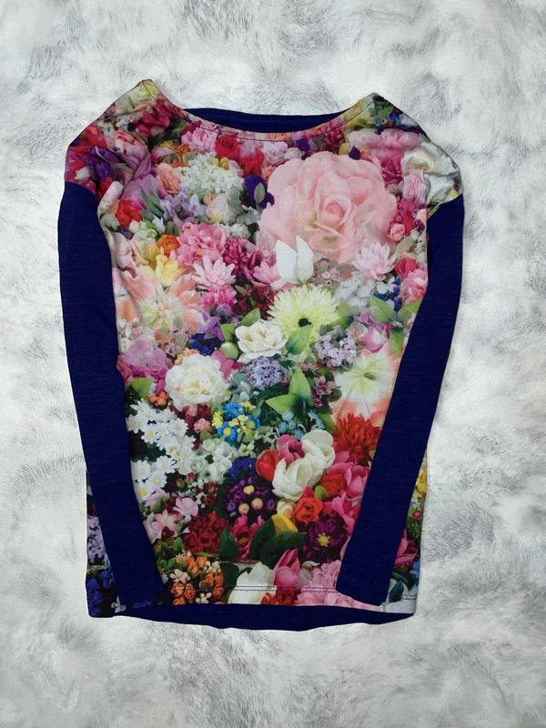 Лонгслив с цветочным принтом Сзади однотонная синяя ткань, как рукава. Состояние отличное без дефектов 🏷Orchestra 8 лет Длина 45. ПОГ 36. Рукав от шеи 48