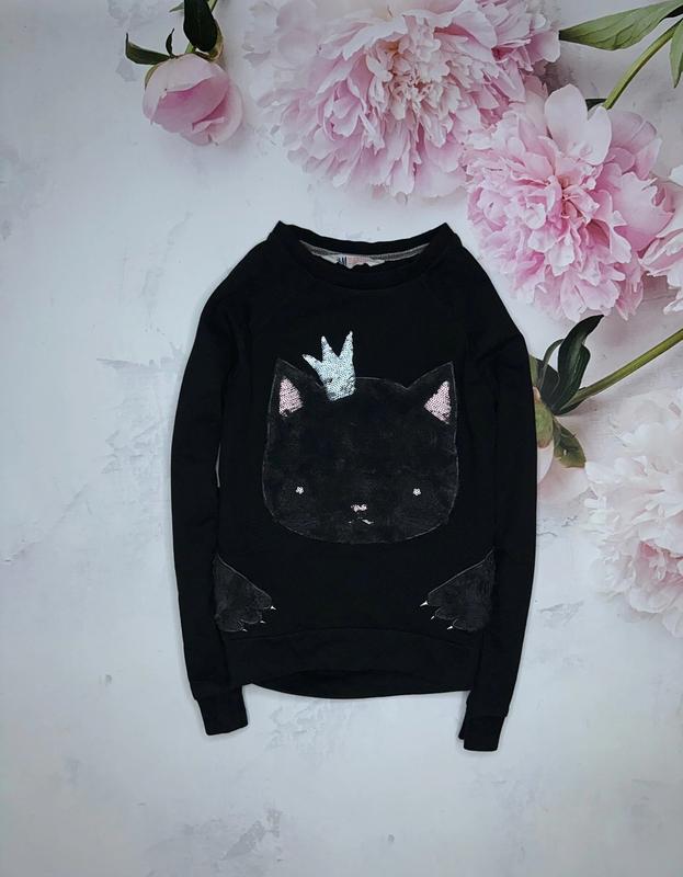 Свитшот с котиком Рисунок мягкий из махровой ткани Состояние отличное без дефектов 🏷️h&m 8-10 лет/134-140 Длина 49/51. ПОГ 39. Рукав от шеи 59