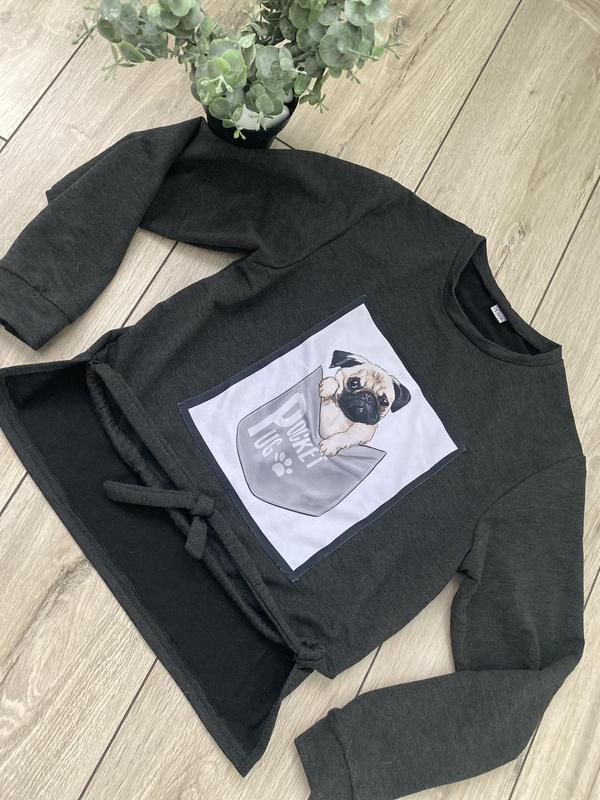 Новая кофта свитшот для девочки. Перед более короткий, задняя часть удлинена. Темно- серого цвета. на возраст 12 лет.