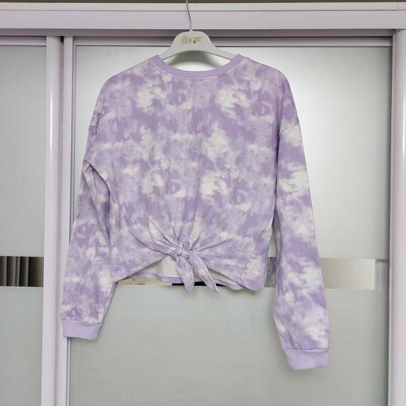 Стильний світшот на ніжному флісі. Спереді завязується на вузлик. Стан ідеальний. Заміри на фото. Розмір вказаний 13-14р,але маломірить. Орієнтуйтесь по замірах.