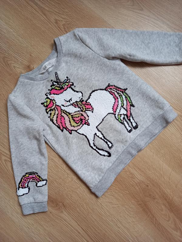 Свитшот для девочки, 3-4 года, цвет светло-серый, аппликация из пайеток единорог, состояние идеальное. Цена 148 грн.