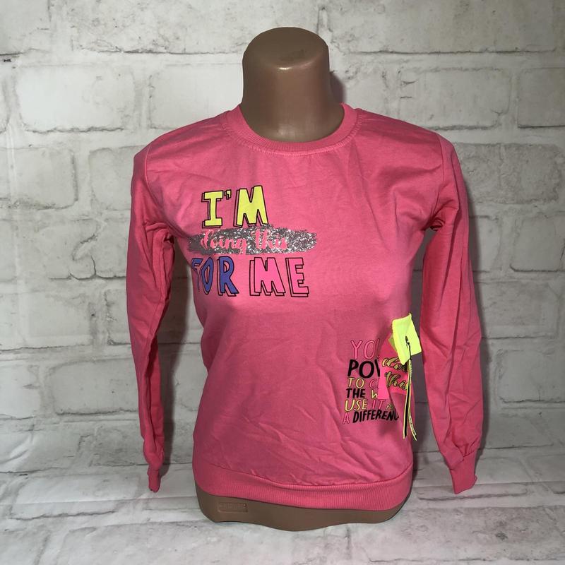 Свитшот для девочки. Рисунок накат, нашивка, глиттер. Турция. Размер: 📌134 см: длина рукава от плеча 44 см, длина 50 см, ПОГ 37 см. 📌140 см: длина рукава от плеча 46 см, длина 52 см, ПОГ 38 см. 📌152 см: длина рукава от плеча 51 см, длина 56 см, ПОГ 42 см.