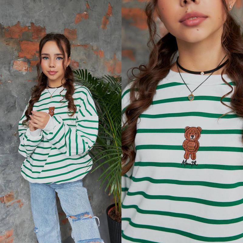 Таня Світшот у смужку подовжене зі справжньою вишивкою "ВІННІ" Тканина турецька петля манжети рібана колір смужки зелений СУПЕР ЯКІСТЬ розмір/довжина/пог/рукав від горловини похибка+-2см 140-146/55/52/59-1шт 146-152/58/54/61-1шт 152-158/61/56/65-1шт 158-164/65/58/68-1шт 164-170/70/60/72-1шт