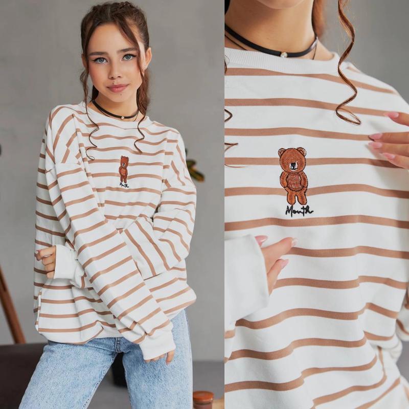 Таня Свитшот в полоску удлиненное с настоящей вышивкой "ВЕННИ" Ткань турецкая петля манжеты зерена цвет полоски беж СУПЕР КАЧЕСТВО размер/длина/пог/рукав от горловины похибка+-2см 140-146/55/52/59-1шт 146-152/58/54/61-1шт 152-158/61/56/65-1шт 158-164/65/58/68-1шт