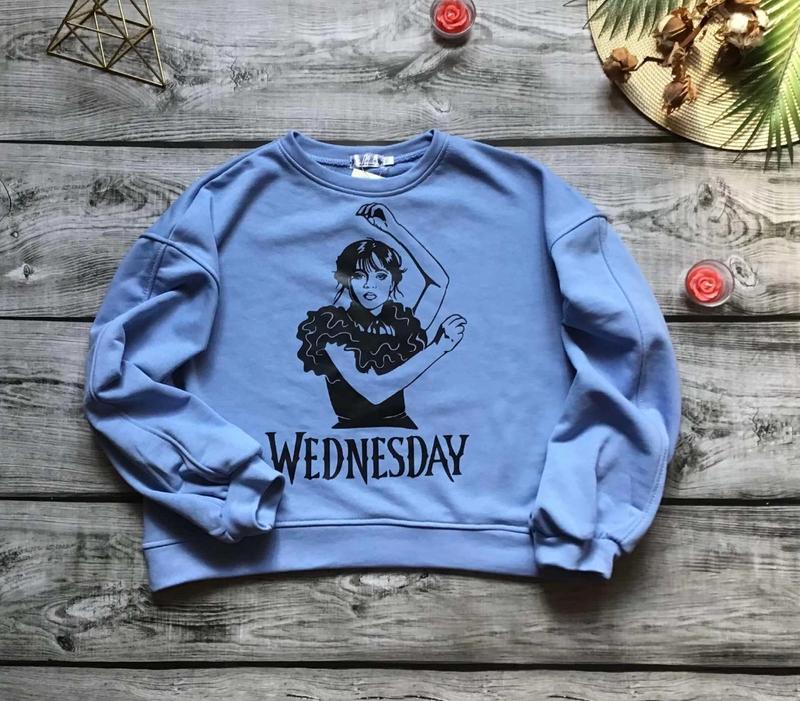 Світшот " Wednesday", Ткань-турецкая двунитка пенье (обратная сторона-петля), манжеты рибана. 164 длина - 57см, полуобхват груди - 59см, рукав от горловины - 72см. Мс