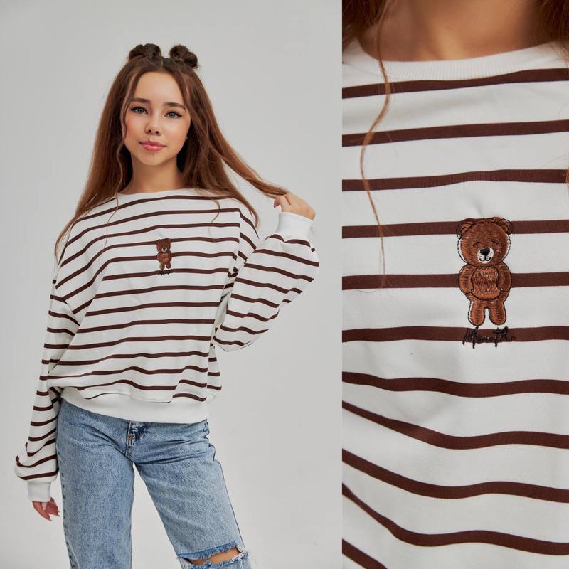 Свитшот в полоску с настоящей вышивкой "ВЕННИ" Ткань турецкая петля (не скатывается) манжеты зерена цвет полоски коричневый СУПЕР КАЧЕСТВО размер/длина/пог/рукав от горловины похибка+-2см 140-146/45/52/58-1шт 146-152/46/54/61-1шт 152-158/49/56/65-1шт 158-164/52/58/67-1шт