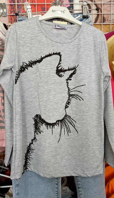 Хлопковый свитшот для девочки. Контур котика из страз. Тонкий и легкий.