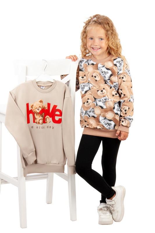 Комплект состоит из двух свитшотов: один из однотонного, второй – из набивного футера с начесом. Модель свободно кроя, с приспущенным рукавом, округлой горловиной. Манжеты и горловина выполнены из стрейча. По переду однотонного світшота нанесений накат методом шовкотрафаретного друку. Модель представлена в актуальных в этом сезоне цветах. Полотно качественное, с натуральным составом, имеет хорошую теплоизоляцию, мягкий начес приятный к телу. Полотно: футер с начесом. Состав: 100% хлопок. ,,2258