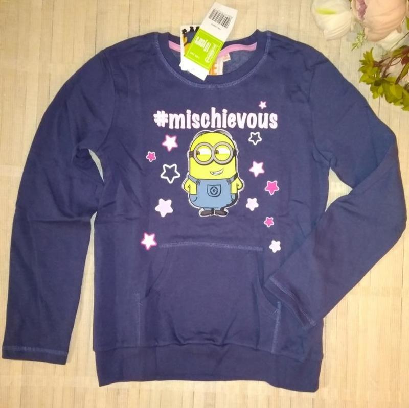 140 / 10 лет Теплый свитшот без капюшона на байке от Despicable Me Гидкое Я. Размер 140 см / 10 лет Состав: 80% хлопок 20% полиэстер Замеры: - Ширина в плечах – 32,5 см - Ширина в груди - 39 см -Длина от плеча горловины / воротника - 9 см -Длина рукава от плечевого шва - 50 см -Длина изделия по спине - 54 см.