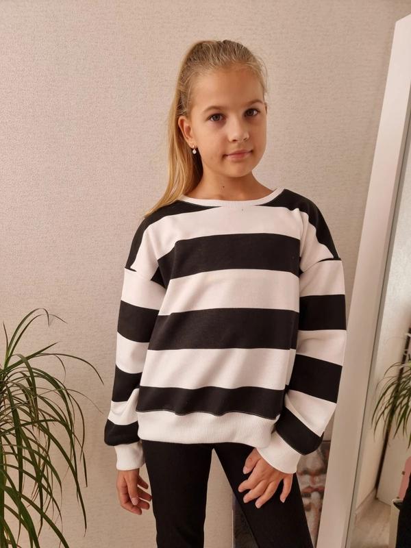 Світшот у смужку дуже актуальний у цьому сезоні турецька тканина тринитка петля якості піньє головина і манжети- рібана заміри-довжина\пог\рукав від гороловини 128-49/49/60 140-51/50/63 152-55/52/66 164-57/53/69