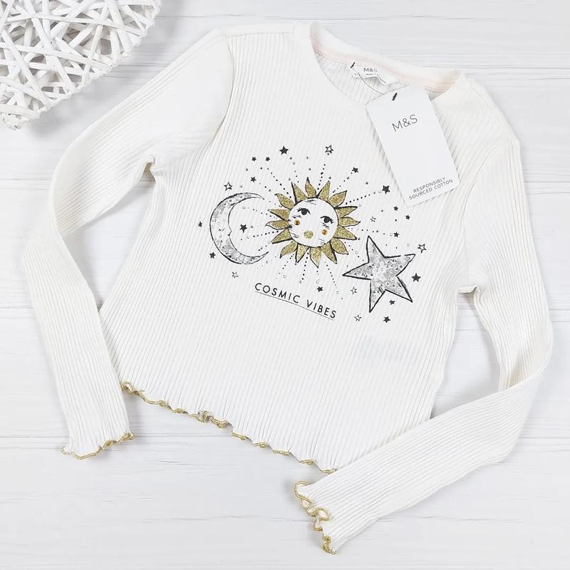 Цена сайта 460 грн. Регланчик в рубчик со стразами от Marks & Spenser 6-7 лет, 116-122 см. ▪️новый ▪️ткань 95 котон и 5 эластан ▪️произв. Бангладеш Плечи 26 Пог 30, тянется Длина 34.5 Рукав от плеча 42